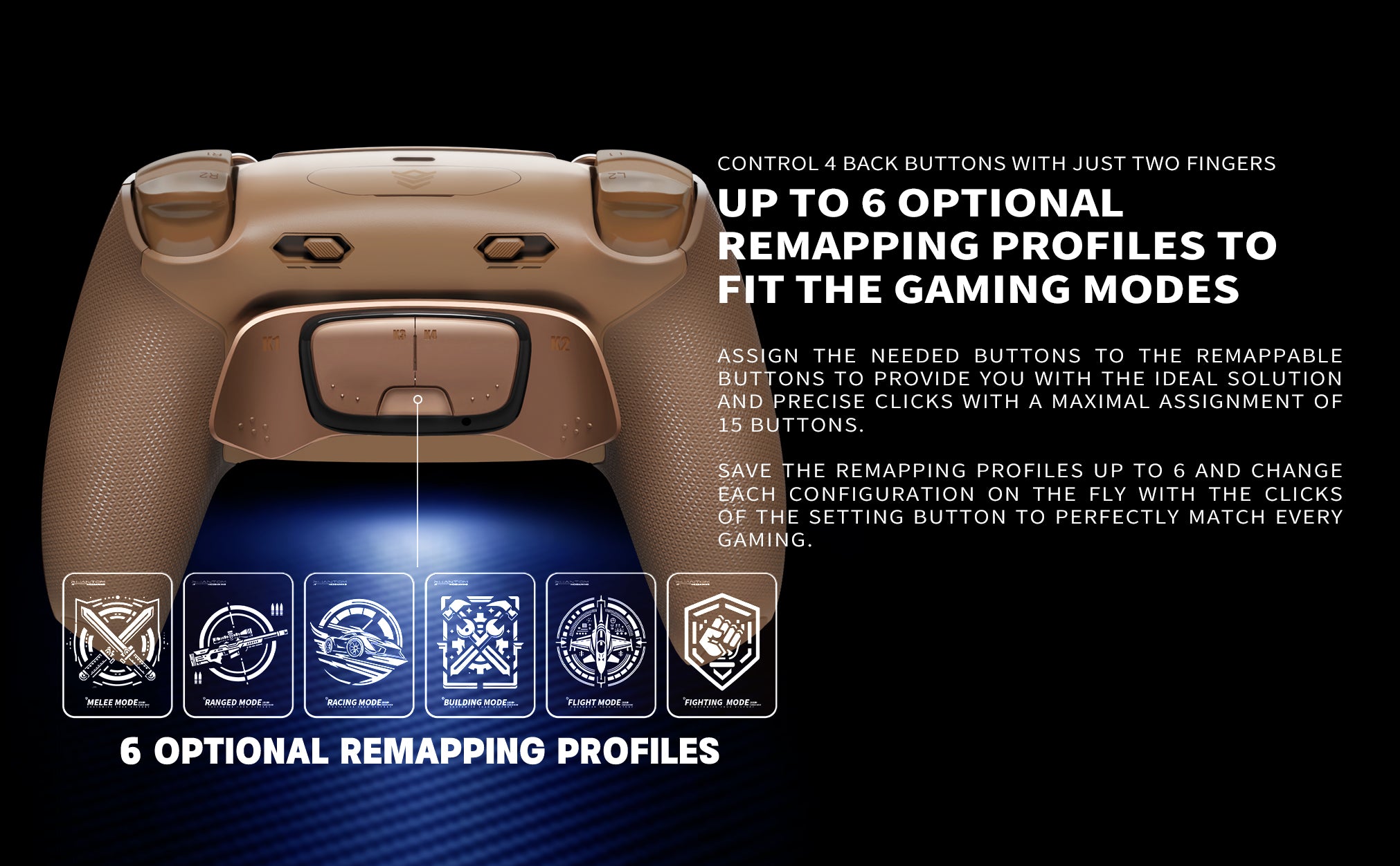 Rückseitige Bedienelemente – Steuern Sie die vier rückseitigen Tasten ganz einfach mit zwei Fingern. Erhöhte Anti-Rutsch-Noppen verhindern versehentliche Betätigungen. Enthält sechs austauschbare Profile für vielseitige Anpassungsmöglichkeiten.
