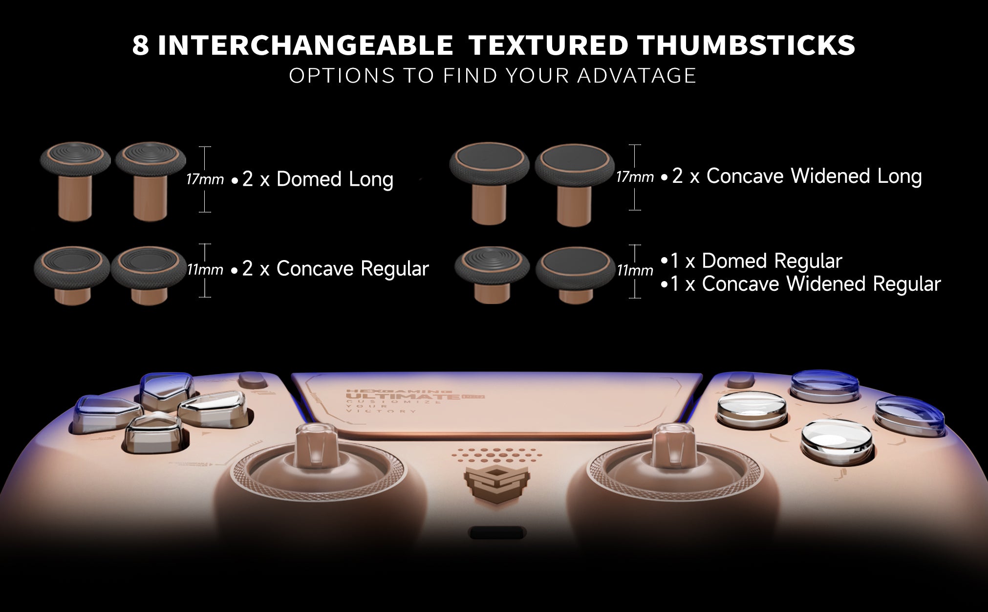 8 austauschbare, strukturierte Thumbsticks für deinen entscheidenden Vorteil.